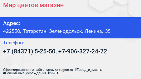 Мир цветов, магазин по адресу 422550, Татарстан, Зеленодольск, Ленина, 35 в дальнейшем Организация, размещена в следующих категориях: