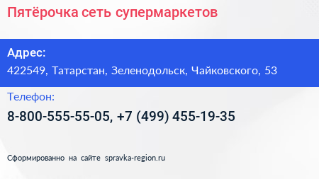 Пятёрочка, сеть супермаркетов по адресу 422549, Татарстан, Зеленодольск, Чайковского, 53 в дальнейшем Организация, размещена в следующих категориях: