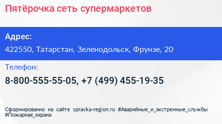 Пятёрочка, сеть супермаркетов по адресу 422550, Татарстан, Зеленодольск, Фрунзе, 20 в дальнейшем Организация, размещена в следующих категориях: