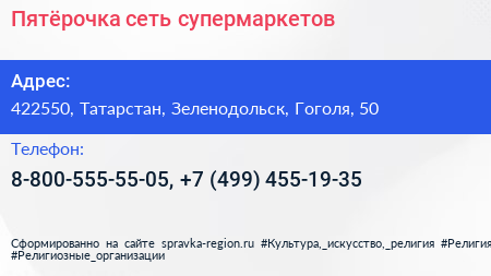 Пятёрочка, сеть супермаркетов по адресу 422550, Татарстан, Зеленодольск, Гоголя, 50 в дальнейшем Организация, размещена в следующих категориях: