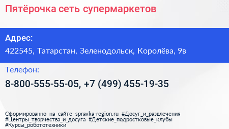 Пятёрочка, сеть супермаркетов по адресу 422545, Татарстан, Зеленодольск, Королёва, 9в в дальнейшем Организация, размещена в следующих категориях: