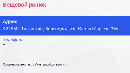 Вещевой рынок по адресу 422550, Татарстан, Зеленодольск, Карла Маркса, 39в в дальнейшем Организация, размещена в следующих категориях: