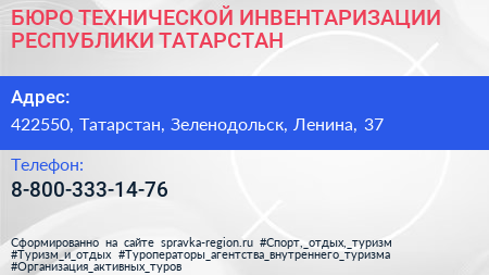 БЮРО ТЕХНИЧЕСКОЙ ИНВЕНТАРИЗАЦИИ РЕСПУБЛИКИ ТАТАРСТАН по адресу 422550, Татарстан, Зеленодольск, Ленина, 37 в дальнейшем Организация, размещена в следующих категориях: