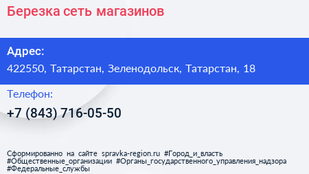 Березка, сеть магазинов по адресу 422550, Татарстан, Зеленодольск, Татарстан, 18 в дальнейшем Организация, размещена в следующих категориях: