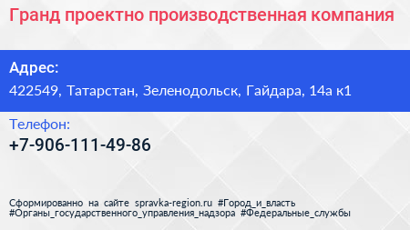 Гранд, проектно-производственная компания по адресу 422549, Татарстан, Зеленодольск, Гайдара, 14а к1 в дальнейшем Организация, размещена в следующих категориях: