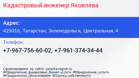 Кадастровый инженер Яковлева по адресу 425016, Татарстан, Зеленодольск, Центральная, 4 в дальнейшем Организация, размещена в следующих категориях: