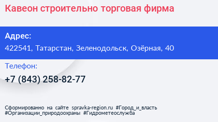 Кавеон, строительно-торговая фирма по адресу 422541, Татарстан, Зеленодольск, Озёрная, 40 в дальнейшем Организация, размещена в следующих категориях:
