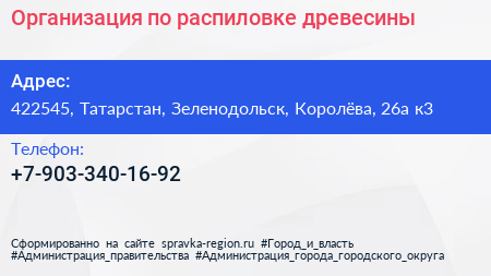 Организация по распиловке древесины по адресу 422545, Татарстан, Зеленодольск, Королёва, 26а к3 в дальнейшем Организация, размещена в следующих категориях: