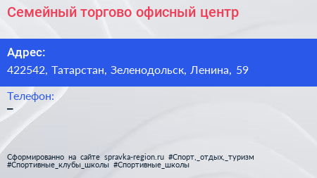 Семейный, торгово-офисный центр по адресу 422542, Татарстан, Зеленодольск, Ленина, 59 в дальнейшем Организация, размещена в следующих категориях: