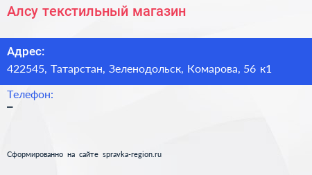 Алсу, текстильный магазин по адресу 422545, Татарстан, Зеленодольск, Комарова, 56 к1 в дальнейшем Организация, размещена в следующих категориях:
