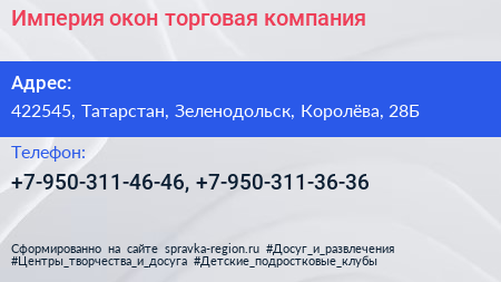 Империя окон, торговая компания по адресу 422545, Татарстан, Зеленодольск, Королёва, 28Б в дальнейшем Организация, размещена в следующих категориях: