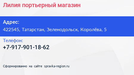 Лилия, портьерный магазин по адресу 422545, Татарстан, Зеленодольск, Королёва, 5 в дальнейшем Организация, размещена в следующих категориях:
