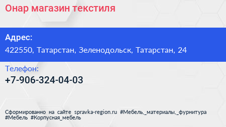 Онар, магазин текстиля по адресу 422550, Татарстан, Зеленодольск, Татарстан, 24 в дальнейшем Организация, размещена в следующих категориях: