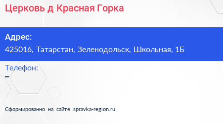 Церковь, д. Красная Горка по адресу 425016, Татарстан, Зеленодольск, Школьная, 1Б в дальнейшем Организация, размещена в следующих категориях: