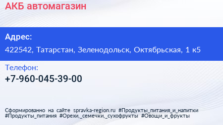 АКБ, автомагазин по адресу 422542, Татарстан, Зеленодольск, Октябрьская, 1 к5 в дальнейшем Организация, размещена в следующих категориях: