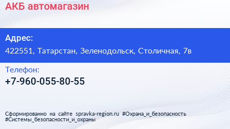 АКБ, автомагазин по адресу 422551, Татарстан, Зеленодольск, Столичная, 7в в дальнейшем Организация, размещена в следующих категориях: