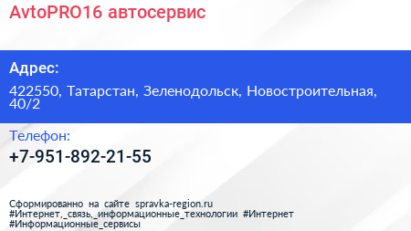 AvtoPRO16, автосервис по адресу 422550, Татарстан, Зеленодольск, Новостроительная, 40/2 в дальнейшем Организация, размещена в следующих категориях: