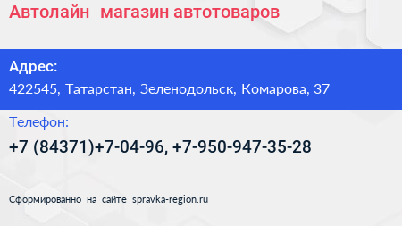 Автолайн+, магазин автотоваров по адресу 422545, Татарстан, Зеленодольск, Комарова, 37 в дальнейшем Организация, размещена в следующих категориях: