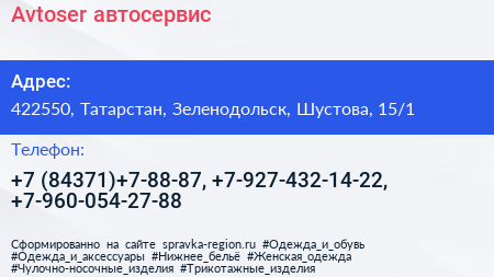 Avtoser, автосервис по адресу 422550, Татарстан, Зеленодольск, Шустова, 15/1 в дальнейшем Организация, размещена в следующих категориях: