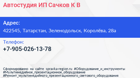 Автостудия, ИП Сачков К.В. по адресу 422545, Татарстан, Зеленодольск, Королёва, 28а в дальнейшем Организация, размещена в следующих категориях: