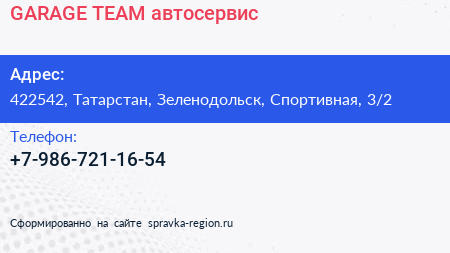 GARAGE TEAM, автосервис по адресу 422542, Татарстан, Зеленодольск, Спортивная, 3/2 в дальнейшем Организация, размещена в следующих категориях: