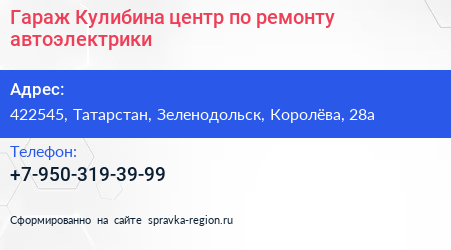 Гараж Кулибина, центр по ремонту автоэлектрики по адресу 422545, Татарстан, Зеленодольск, Королёва, 28а в дальнейшем Организация, размещена в следующих категориях: