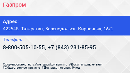 Газпром по адресу 422548, Татарстан, Зеленодольск, Кирпичная, 16/1 в дальнейшем Организация, размещена в следующих категориях: