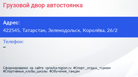 Грузовой двор, автостоянка по адресу 422545, Татарстан, Зеленодольск, Королёва, 26/2 в дальнейшем Организация, размещена в следующих категориях: