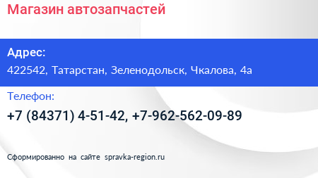 Магазин автозапчастей по адресу 422542, Татарстан, Зеленодольск, Чкалова, 4а в дальнейшем Организация, размещена в следующих категориях: