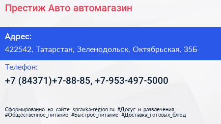 Престиж Авто, автомагазин по адресу 422542, Татарстан, Зеленодольск, Октябрьская, 35Б в дальнейшем Организация, размещена в следующих категориях: