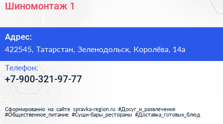 Шиномонтаж №1 по адресу 422545, Татарстан, Зеленодольск, Королёва, 14а в дальнейшем Организация, размещена в следующих категориях: