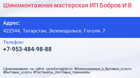 Шиномонтажная мастерская, ИП Бобров И.В. по адресу 422544, Татарстан, Зеленодольск, Гоголя, 7 в дальнейшем Организация, размещена в следующих категориях: