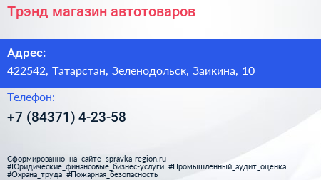 Трэнд, магазин автотоваров по адресу 422542, Татарстан, Зеленодольск, Заикина, 10 в дальнейшем Организация, размещена в следующих категориях: