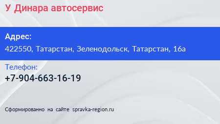 У Динара, автосервис по адресу 422550, Татарстан, Зеленодольск, Татарстан, 16а в дальнейшем Организация, размещена в следующих категориях: