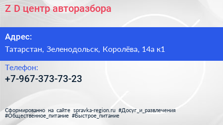 Z.D, центр авторазбора по адресу Татарстан, Зеленодольск, Королёва, 14а к1 в дальнейшем Организация, размещена в следующих категориях: