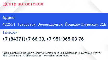 Центр автостекол по адресу 422551, Татарстан, Зеленодольск, Йошкар-Олинская, 21Б в дальнейшем Организация, размещена в следующих категориях: