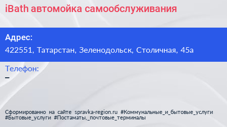 iBath, автомойка самообслуживания по адресу 422551, Татарстан, Зеленодольск, Столичная, 45а в дальнейшем Организация, размещена в следующих категориях: