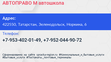 АВТОПРАВО-М, автошкола по адресу 422550, Татарстан, Зеленодольск, Норкина, 6 в дальнейшем Организация, размещена в следующих категориях: