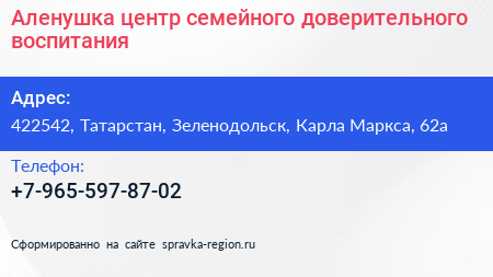 Аленушка, центр семейного доверительного воспитания по адресу 422542, Татарстан, Зеленодольск, Карла Маркса, 62а в дальнейшем Организация, размещена в следующих категориях: