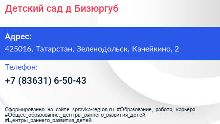 Детский сад, д. Бизюргуб по адресу 425016, Татарстан, Зеленодольск, Качейкино, 2 в дальнейшем Организация, размещена в следующих категориях: