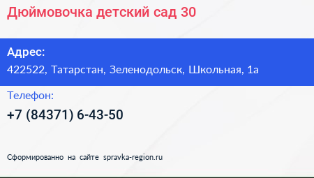 Дюймовочка, детский сад №30 по адресу 422522, Татарстан, Зеленодольск, Школьная, 1а в дальнейшем Организация, размещена в следующих категориях: