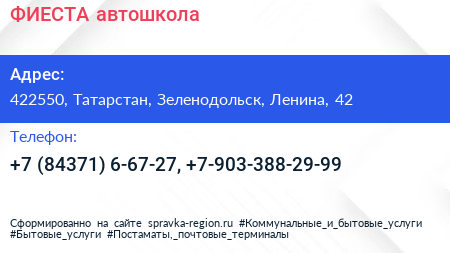 ФИЕСТА, автошкола по адресу 422550, Татарстан, Зеленодольск, Ленина, 42 в дальнейшем Организация, размещена в следующих категориях: