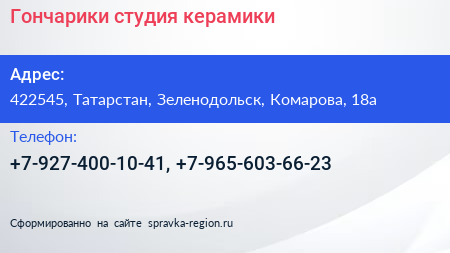 Гончарики, студия керамики по адресу 422545, Татарстан, Зеленодольск, Комарова, 18а в дальнейшем Организация, размещена в следующих категориях: