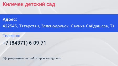 Килечек, детский сад по адресу 422545, Татарстан, Зеленодольск, Салиха Сайдашева, 7а в дальнейшем Организация, размещена в следующих категориях: