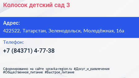 Колосок, детский сад №3 по адресу 422522, Татарстан, Зеленодольск, Молодёжная, 16а в дальнейшем Организация, размещена в следующих категориях: