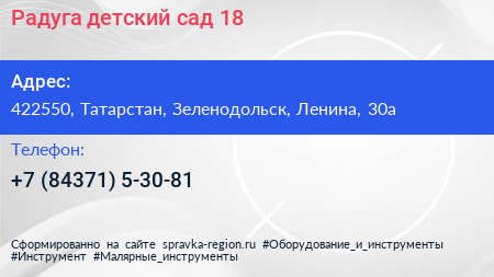 Радуга, детский сад №18 по адресу 422550, Татарстан, Зеленодольск, Ленина, 30а в дальнейшем Организация, размещена в следующих категориях: