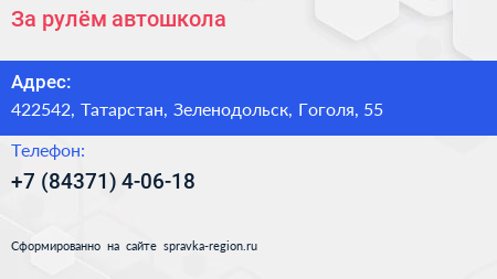 За рулём, автошкола по адресу 422542, Татарстан, Зеленодольск, Гоголя, 55 в дальнейшем Организация, размещена в следующих категориях: