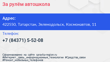 За рулём, автошкола по адресу 422550, Татарстан, Зеленодольск, Космонавтов, 11 в дальнейшем Организация, размещена в следующих категориях: