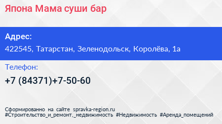 Япона Мама, суши-бар по адресу 422545, Татарстан, Зеленодольск, Королёва, 1а в дальнейшем Организация, размещена в следующих категориях: