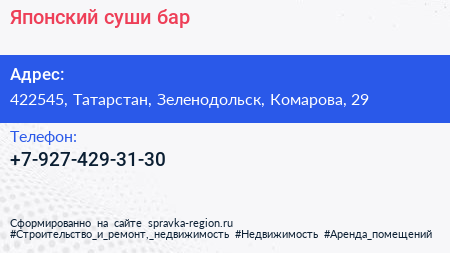 Японский, суши-бар по адресу 422545, Татарстан, Зеленодольск, Комарова, 29 в дальнейшем Организация, размещена в следующих категориях: